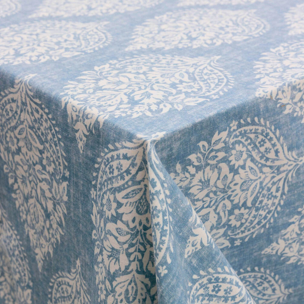 Chambray Blue Meadow Ridge features a delicate white floral and paisley-inspired pattern over a textured chambray blue background, perfect for creating a refined, vintage feel in event table settings. This soft yet striking fabric adds a touch of charm to weddings, garden parties, and upscale rustic celebrations. Its timeless design is ideal for event rental professionals looking to elevate tabletop design with elegance and texture.