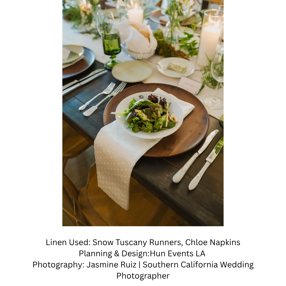 The Snow Chloe napkin is a classic rental linen staple, featuring a timeless Swiss dot pattern woven into a crisp, clean snow white fabric that adds a subtle yet refined texture to any table top design. Effortlessly elegant and endlessly versatile, this napkin complements a wide range of event styles — from rustic barn weddings to formal seated dinners — making it a go-to choice for event rental linen design. The tonal Swiss dot detailing elevates the simplicity of snow white, giving each place setting a polished, thoughtfully curated finish that photographs beautifully.
