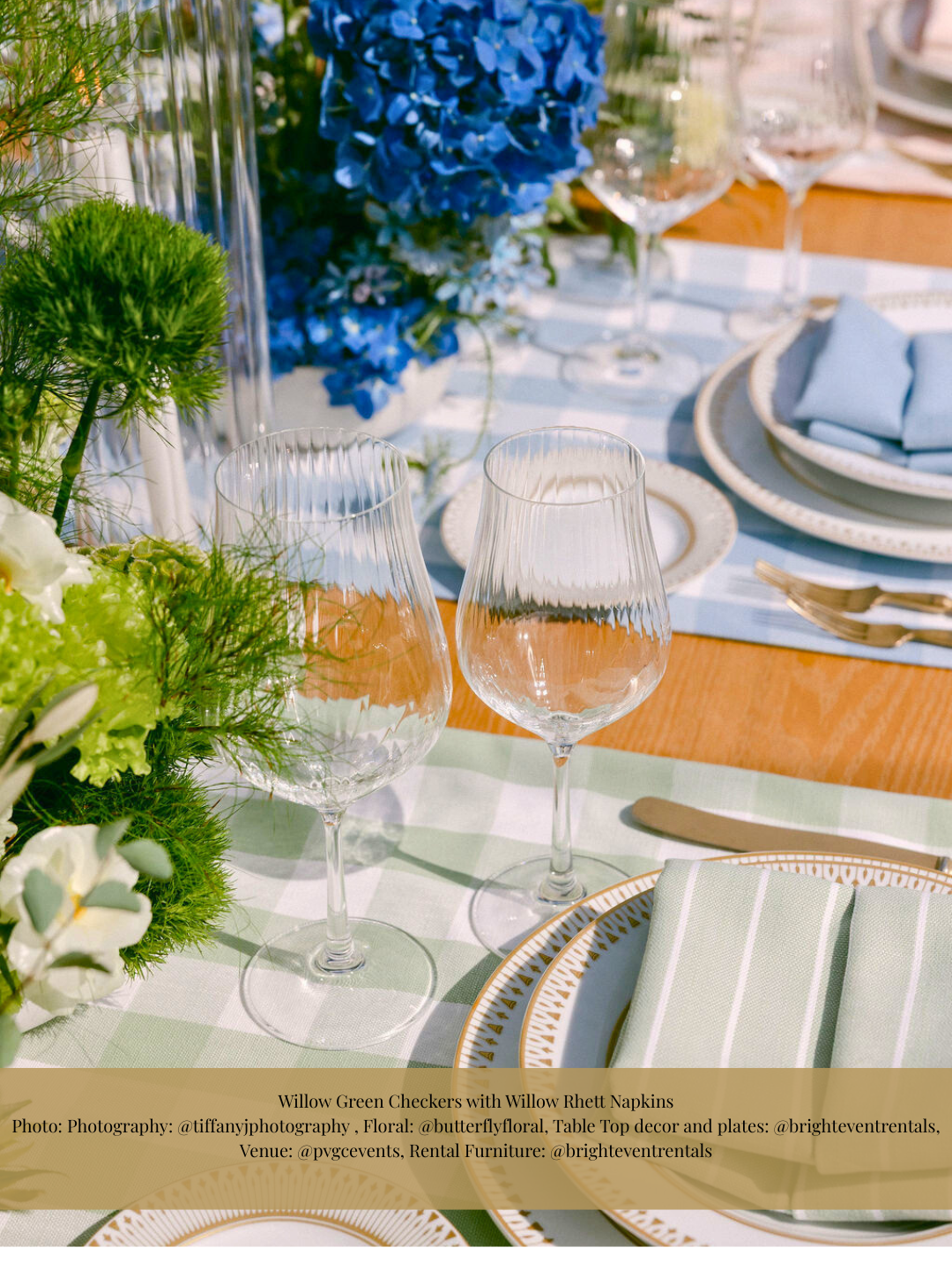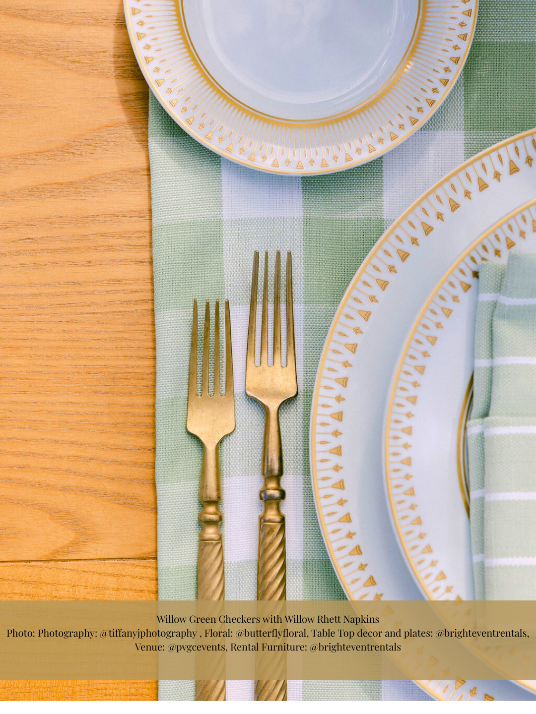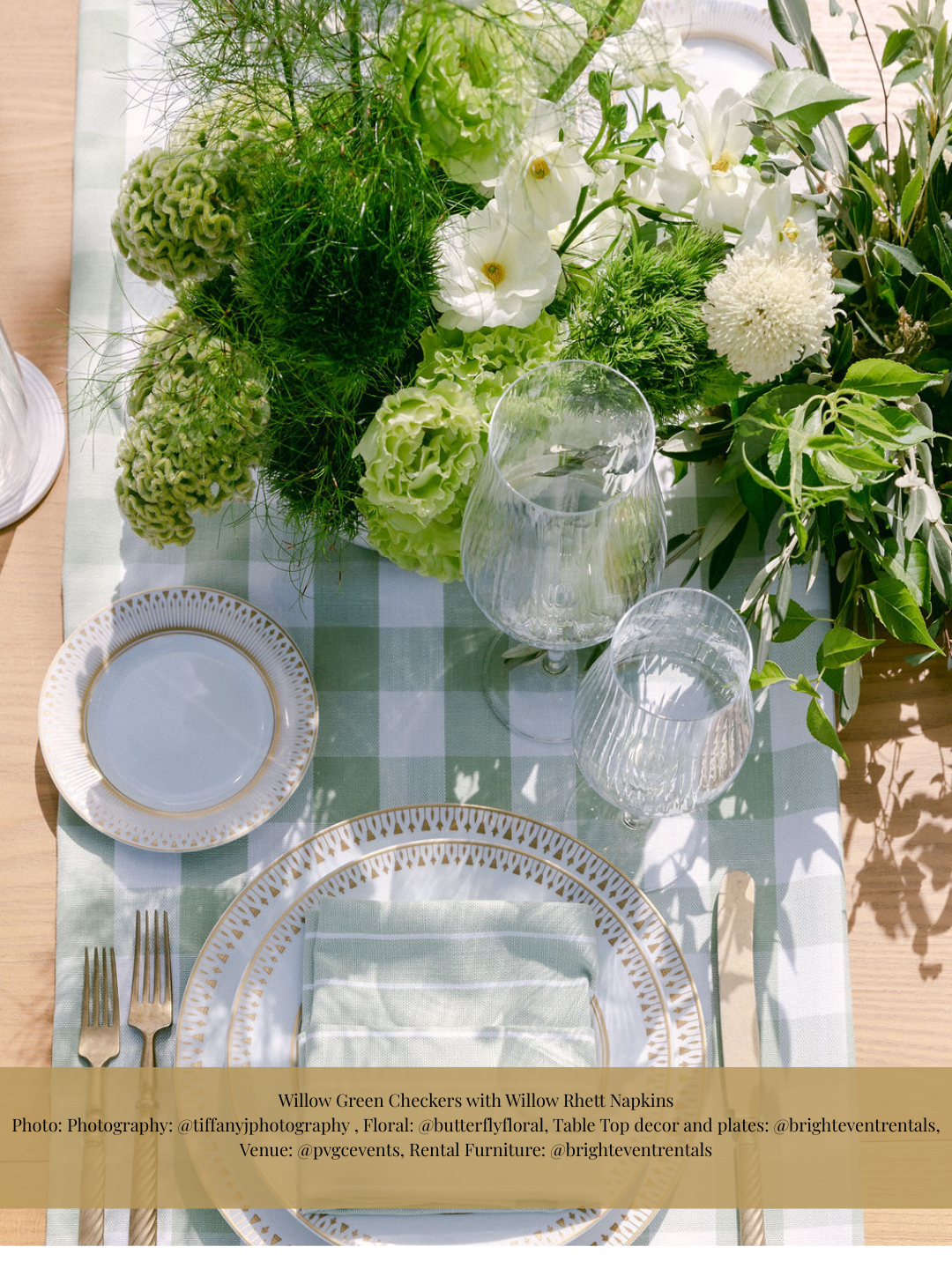 Willow Green Checkers showcases a bold buffalo check pattern in a refreshing sage green and white, woven from yarn-dyed fabric for a crisp, durable finish. This classic design is ideal for garden parties, spring weddings, and rustic-chic event rentals looking to make a charming tabletop statement. Its timeless check pattern brings a playful yet polished feel to any event setting.
